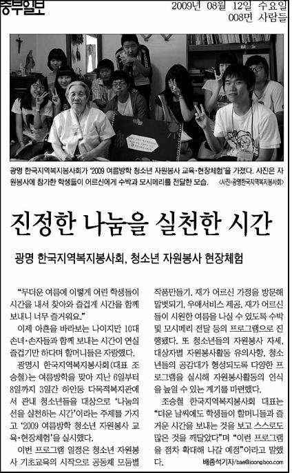 2009년 여름방학 청소년 자원봉사현장체험 페이지 정보 작성자 최고관리자 댓글 0건 조회 6,885회 작성일 09-08-13 00:00 본문 2009년 여름방학 청소년 자원봉사현장체험 목록 이전글사랑나눔을 실천하는 한국지역복지봉사회 09.09.23 다음글광명푸드마켓 개소식2 09.06.10