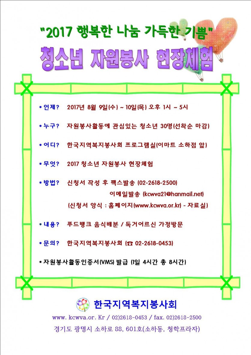 2017년 여름방학을 맞이하여 청소년 자원봉사 현장체험을 진행합니다. 다양한 봉사활동에 참여하여 보람과 의미있는 여름방학을 만들어 보세요