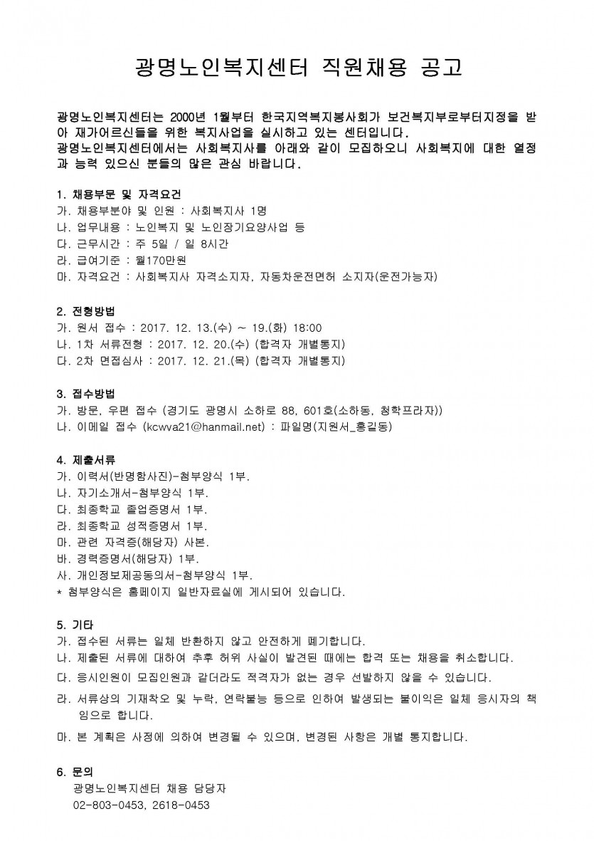 광명노인복지센터 직원채용 공고 페이지 정보 작성자 한국지역복지봉사회 댓글 0건 조회 14,598회 작성일 17-12-13 00:00 본문 광명노인복지센터 직원채용 공고 목록 이전글한국지역복지봉사회 2017년도 결산공고 18.03.12 다음글2017년 청소년 자원봉사 현장체험 신청안내 17.07.17